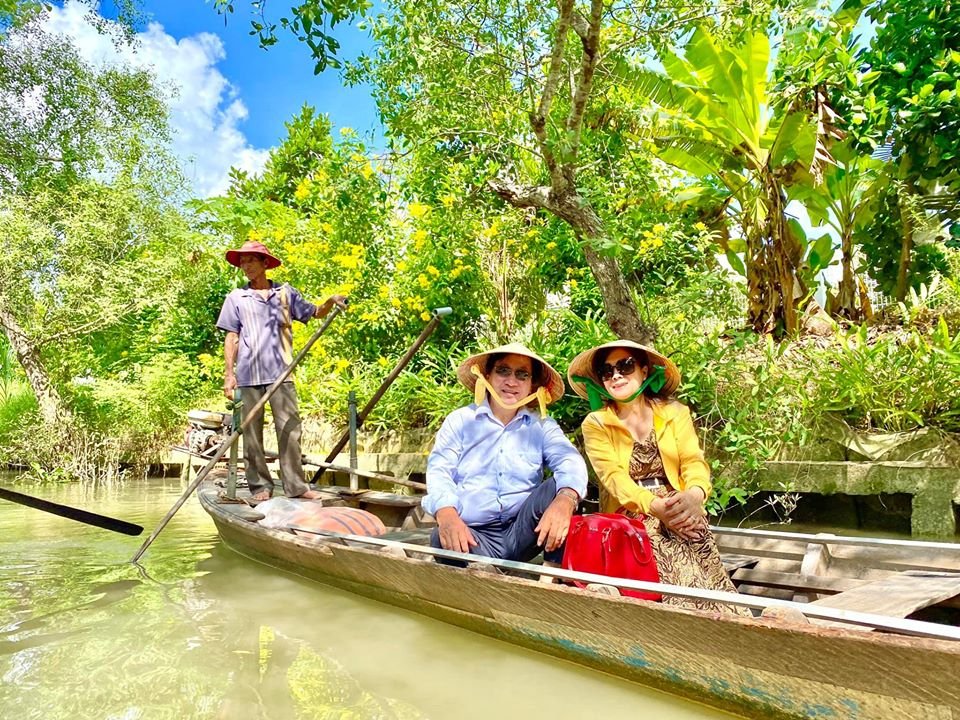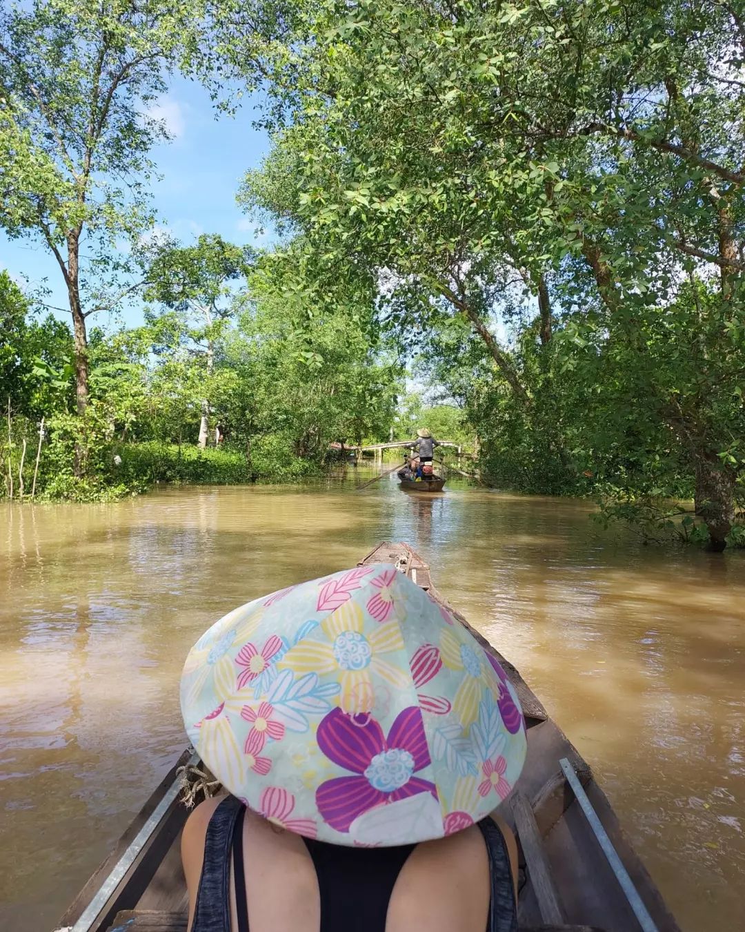 Ngồi xuồng ba lá di chuyển trong rạch nhỏ, ngắm nhìn cảnh làng mạc và hệ thực vật đặc trưng vùng sông nước miền Tây.
